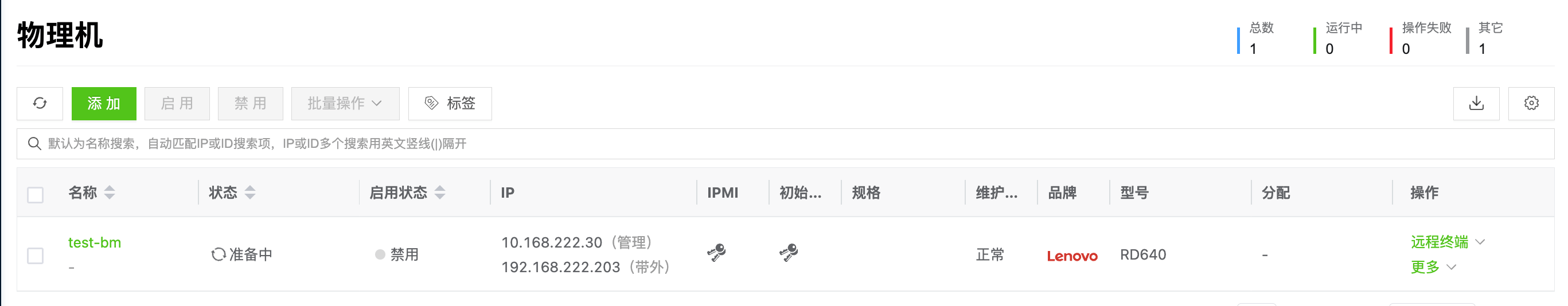 创建完成后,在物理机列表可以看到机器处于“准备中”的状态,并且探测到了品牌为 Lenovo 。(得确保IPMI 可连接到)
