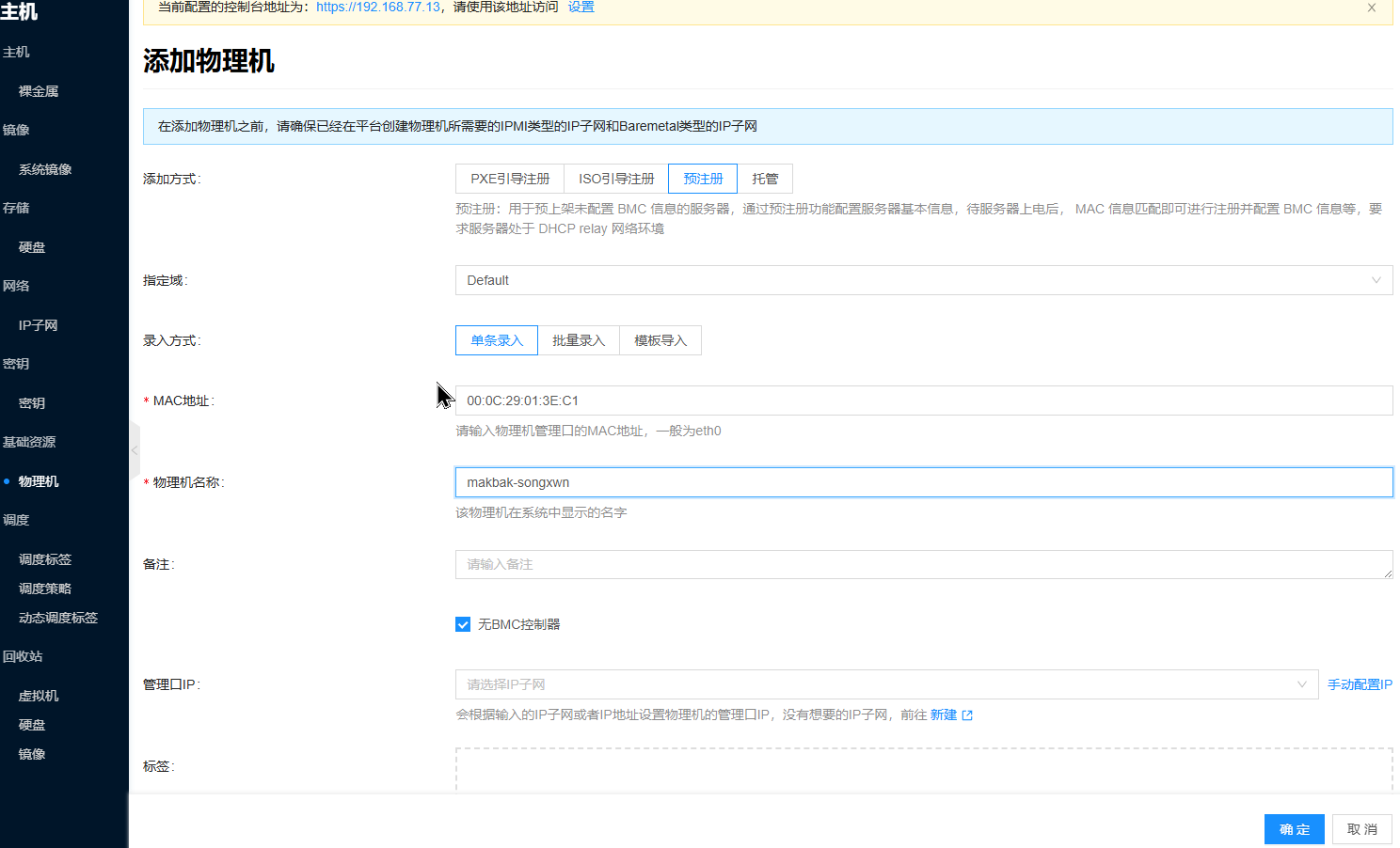 2.2 预注册纳管物理机(无IPMI&BMC)