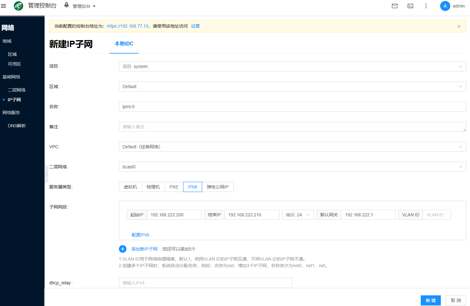 该网段需要包含物理机的 ipmi ip,假设为 192.168.222.200 到 192.168.222.210,网关为 192.168.222.1,名称为 ipmi-0,类型为IPMI。