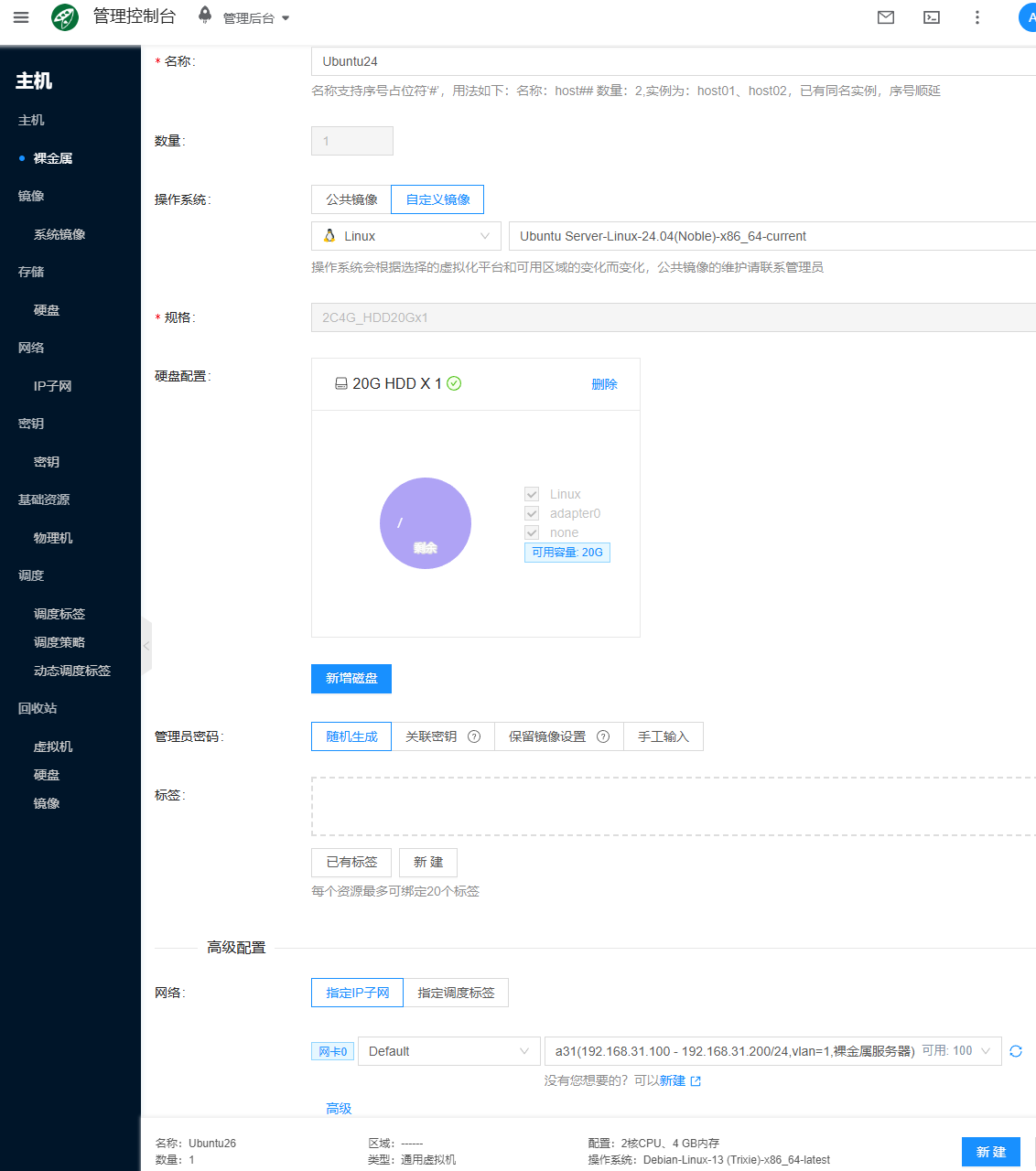此物理机类型网段的开始和结束 ip 范围,以及默认网关是和实际环境网络环境相关的,是对应到交换机和路由器上的配置,注意划分的 ip 不要和已有环境的冲突了