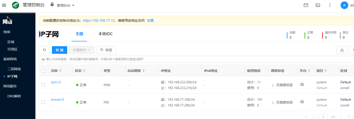 纳管物理机,需要创建PXE、IPMI、物理机 3个类型的 IP 子网。