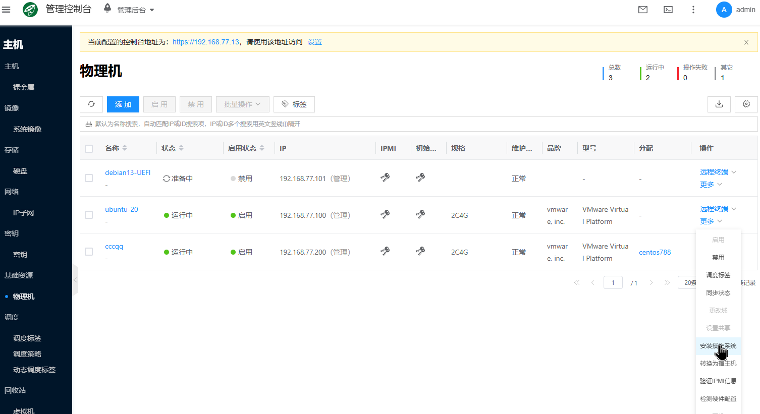 选择一个物理机 点击更多选择启用,然后选择安装操作系统。