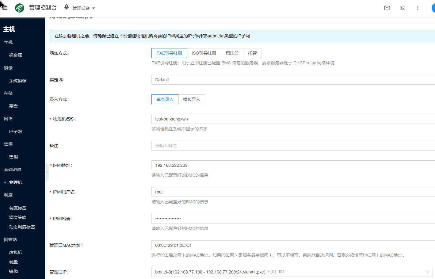 物理机管理服务部署完成后,接下来纳管物理机测试。