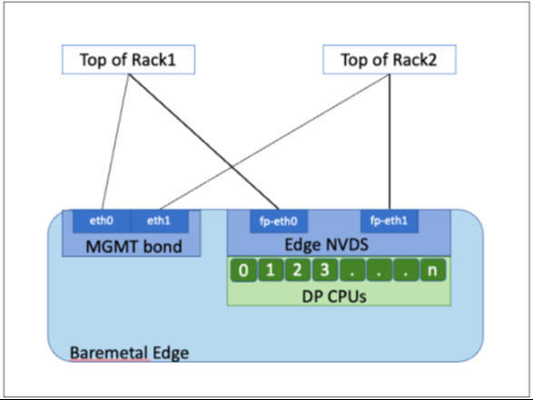 您可以决定如何使用 fp-ethX 接口。在下面的示例物理拓扑中,fp-eth0 和 fp-eth1 绑定在一起并用于 NSX 覆盖网络隧道。fp-eth2 和 fp-eth3 用作到 TOR 的冗余 VLAN 上行链路。