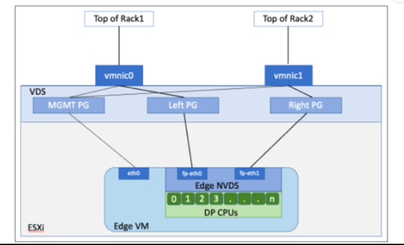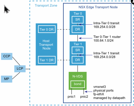 最后,该图显示了绑定在一起以提供高可用性的两个物理网卡(pNIC1 和 pNIC2)的示例。数据路径管理物理网卡。它们可以作为到外部网络的 VLAN 上行链路,或者作为到NSX管理的内部虚拟机网络的隧道端点链路。