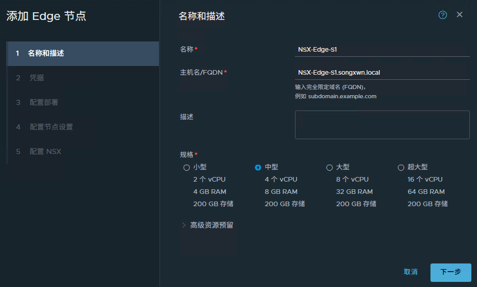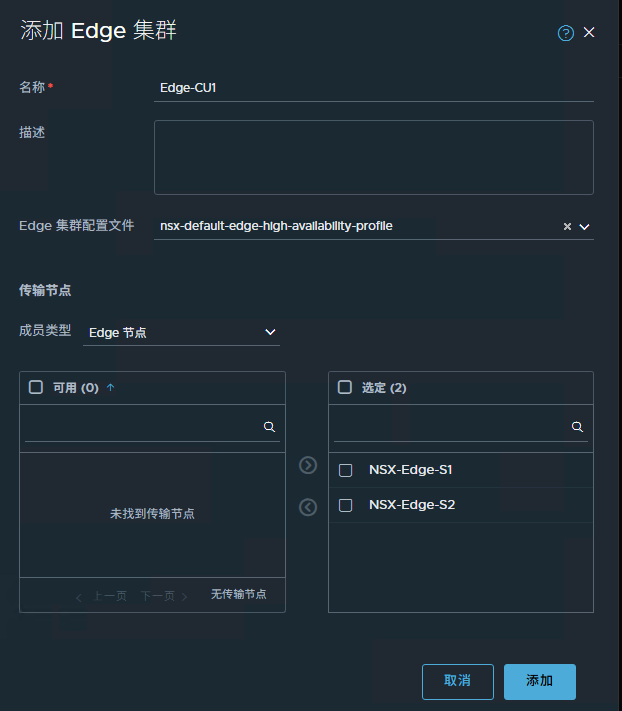 系统 > Fabric > 节点 > Edge 传输节点 > 添加EDGE节点